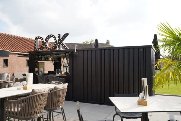 Diese Version unserer Containerbar eignet sich ideal für den Einsatz als Outdoor-Bar auf einer Terrasse. – Zerlegbarer und selbstgebauter Barcontainer