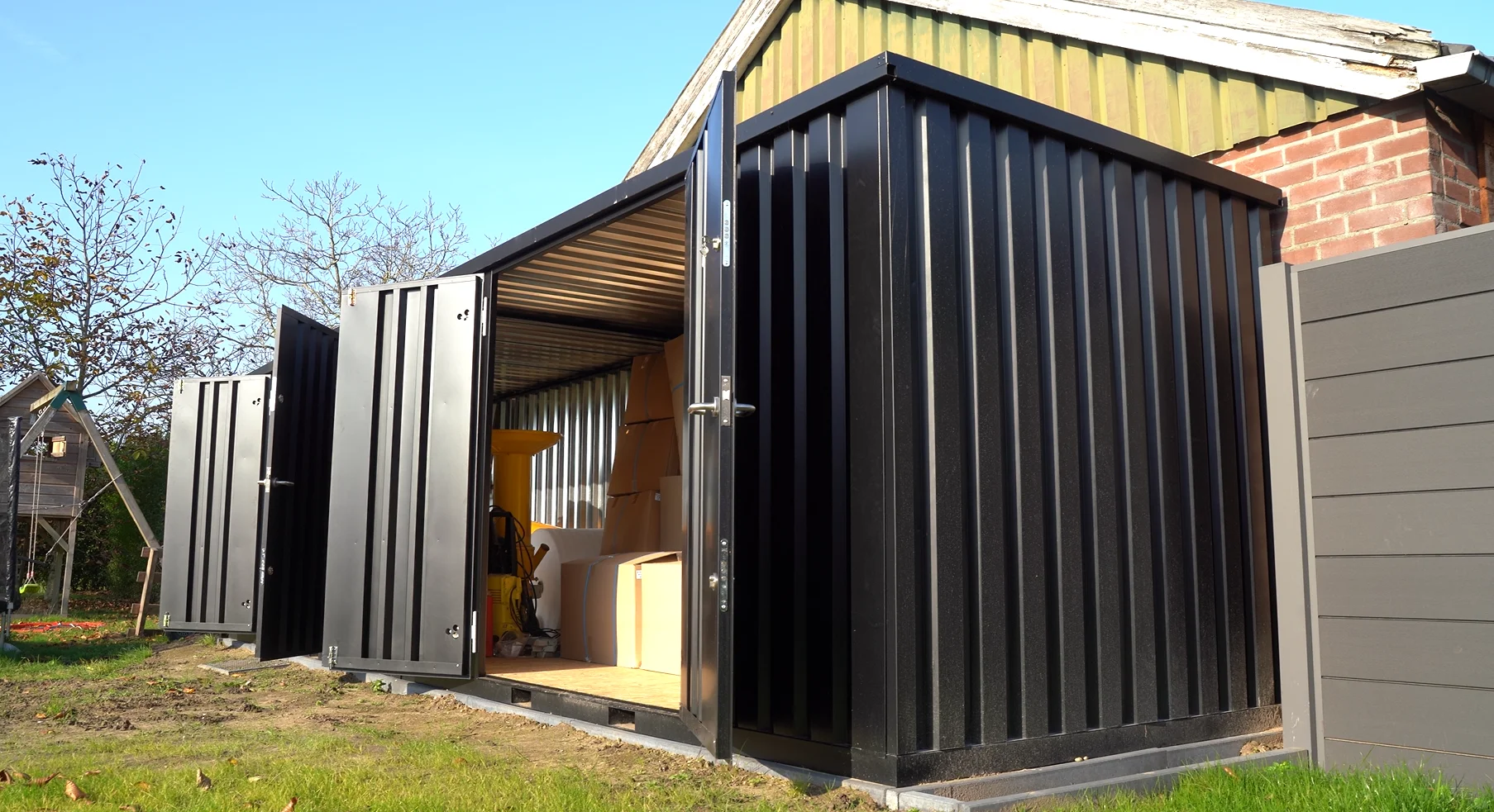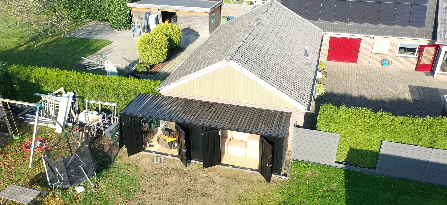Dimensions extérieures (LxBxH): 7765 x 2142 x 2088 mmDimensions intérieures (LxBxH): 7693 x 1990 x 1950 mmTemps d’installation courtEntièrement démontableDisponible dans toutes les couleurs RALConstruction entièrement autoportante, y compris le plancher2 double-portes sont inclus dans le prix! Différents configurations possible, les panneaux de même taille sont interchangeables Nombre de portes sur côté 8 mètres