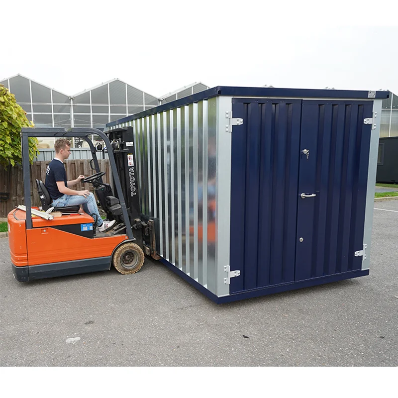 Stahlblauer Behälter 3 x 2 Mit Doppeltür an der Seite 3 Meter (große Seite) Der 3 x 2 Meter große herausnehmbare Behälter ist die perfekte Lösung für die Lagerung, geräumig, ohne zu viel Platz im Garten einzunehmen. Es lässt sich leicht auf- und abbauen und ist perfekt auf Ihre Bedürfnisse abgestimmt. Dank seiner Gabeltaschen und Hebeösen kann er auch an schwer zugänglichen Stellen platziert werden. Und wem das noch nicht reicht, der kann es auch einzeln demontieren und per Hand transportieren, Stück für Stück. Die Bleche unserer Wechselcontainer haben 70 % der Wandstärke von Seecontainern, sind leicht und dennoch stabil. Sie bestehen aus verzinktem Stahl und sind beständig gegen Rost und äußere Einflüsse. Darüber hinaus ist die Dachrinne in die Dachkonstruktion integriert und schützt den Container vor Witterungseinflüssen. Während der Versandcontainer besondere Vorkehrungen erfordert, um Schäden am Boden zu vermeiden, sind unsere abnehmbaren Container die einzigen auf dem Markt, die über einen Doppelboden verfügen, der aus OSB-3-Platten besteht, die auf einem Metallrahmen platziert sind. Wenn Ihr Grundstück also flach ist und das Gewicht des Containers tragen kann, ist keine Bebauung erforderlich. Und wenn Ihr Grundstück nicht ausreichend eben ist, genügen 4 Betonplatten, um den Container zu stützen. Da unsere Container auf der 3-Meter-Seite mit einer großen Doppeltür von 175 Zentimetern ausgestattet sind, haben Sie Zugang zu all Ihren Gegenständen und sind vor Diebstahl geschützt, da unsere Container mit einem doppelten 3-Punkt-Verschluss ausgestattet sind und der Container von innen verschraubt ist. Wir haben auch die Wahl zwischen der Einbruchschutzstange, der Zugangsrampe sowie den 1-Meter- oder 2-Meter-Regalen. Alle unsere Container werden als Bausatz geliefert und müssen selbst zusammengebaut und ausgestattet werden. Zusätzliche Informationen Größe 3 x 2 Meter (5,5 m² / 10 Fuß) Türtypen Doppeltür an der Seite 3 Meter, Doppeltür an der Längsseite Farbe Zweifarbig: Stahlblau / verzinkt Paketgröße bei Lieferung 3100 mm x 2200 mm x 300 mm Gesamtgewicht des Pakets +/- 420 kg Gewicht des schwersten Elements (Boden) +/- 140 kg Lieferung per 21 m Sattelschlepper und Gabelstapler-Montage. Optional 1 bis 2 Personen vor Ort stellen. Garantie 1 Jahr Garantie gegen Durchrostung durch das Werk